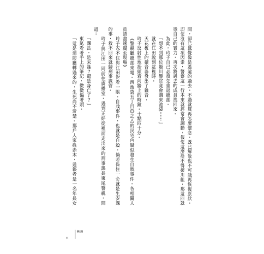 在警視廳總部上百間偵訊室中,姬川玲子挑選了第十一號房。「一」的英文是「one」。讀作「won」就是「勝利」之意。有兩個「勝利」。沒有比十一號房更吉利的偵訊室了。反過來說,這意味著面對這次的嫌犯就需要這等氣勢。