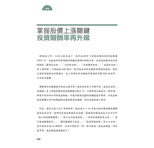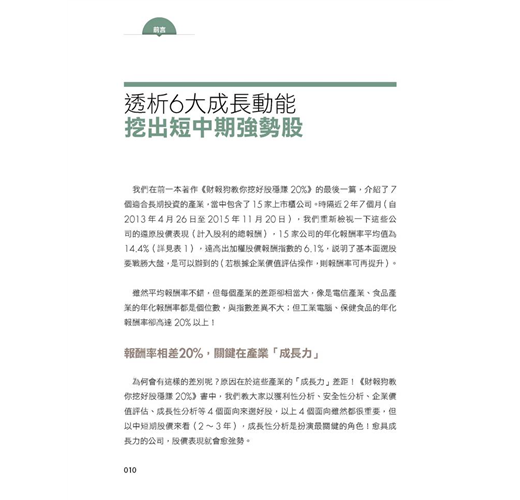 繼暢銷書《財報狗教你挖好股穩賺20%》後,財報狗團隊特別針對「成長力」深入分析。他們從台股近5~10年,獲利與股價顯著成長的公司,找到這些公司的成長動能來自何處。當一家公司具備愈多成長動能,獲利與股價都會出現契機。