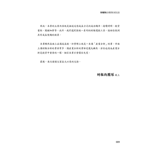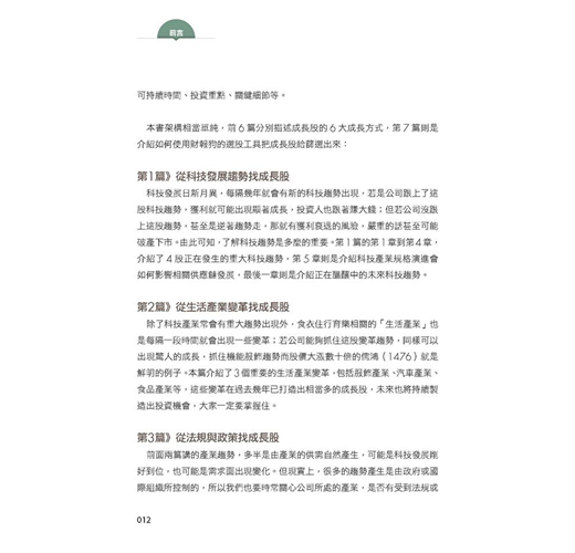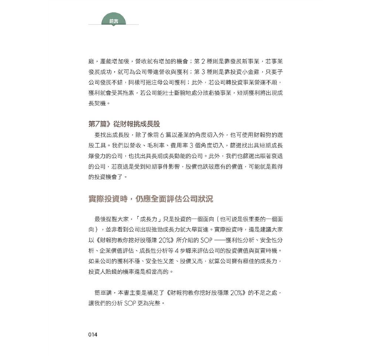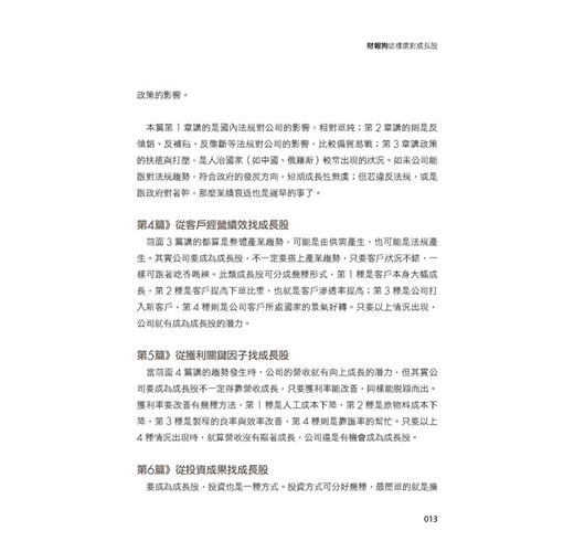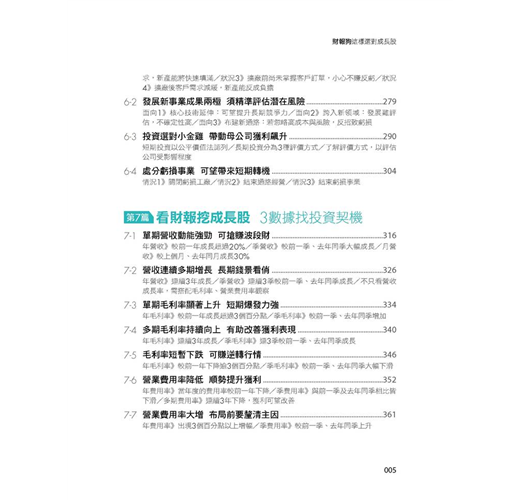 本書架構相當單純,前6篇分別描述成長股的6大成長方式,第7篇則是介紹如何使用財報狗的選股工具把成長股給篩選出來: