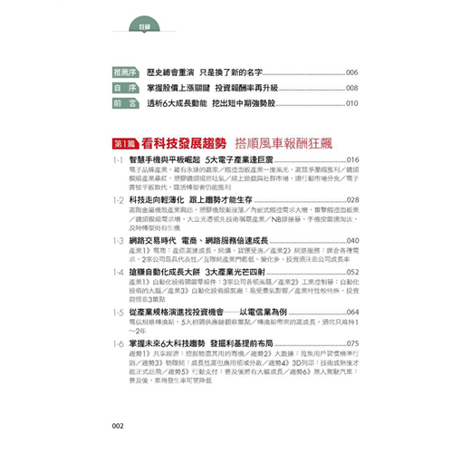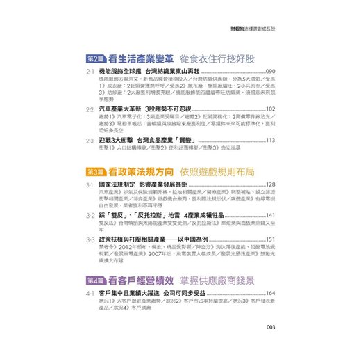 本書介紹的產業範圍遍及電子、網路、民生、汽車……等各大類型產業,搭配實例達200家台灣上市櫃公司,有興趣從進階產業分析學習找好股的投資人,絕對不能錯過。