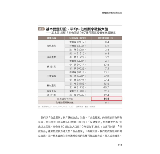 我們在前一本著作的最後一篇,介紹了7個適合長期投資的產業,當中包含了15家上市櫃公司。時隔近2年7個月,我們重新檢視一下這些公司的股價表現,15家公司的年化報酬率平均值為14.4%,遠高出加權指數的6.1%,說明了基本面選股要戰勝大盤,是可以辦到的。