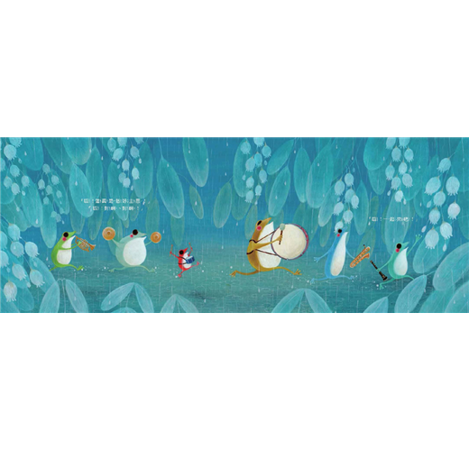 青蛙樂隊們穿過池塘、繡球花叢、陰暗的森林……,還答應鳥兒的要求,穿過層層厚重的雲,準備喚醒太陽。只是,好像還需要更多人的幫忙哩。當大家一起唱歌,讓歡樂的歌聲響徹雲霄,雨天有了不同的意義!而且,快樂好像就加倍了喔。