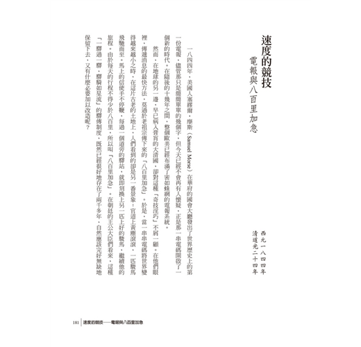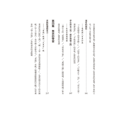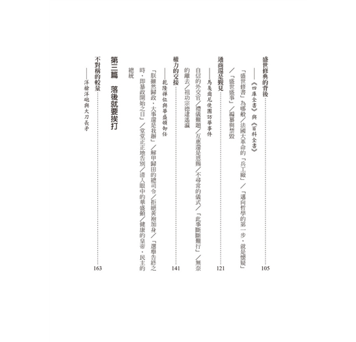 本書作者宛如化身為一位攝影師,穿梭時間與空間,擷取角度、切換鏡頭、按下快門,將十八片秋葉由歷史這棵樹上靜靜飄落的瞬間記錄下來。從兩個男人──康熙皇帝與路易十四嘗試交流接觸,當時的中國與西方幾乎是站在同一起跑線上,到兩個女人──慈禧太后與維多利亞女王權傾天下,卻在世紀之交遭逢一辱一榮的不同命運,此時西風早已壓倒東風了。這十八個歷史實例,前後跨越二百餘年(一六八八~一九○○),而且放眼整個世界,或以人物、或以事件、或以文化成就、或以制度沿革、或以軍事體系、或以科學發明、或以思想觀念為對象進行比較,客觀地呈現出中華文明落後於西方的前因後果。其中慘痛而深刻的歷史教訓,值得今人銘記與反思。