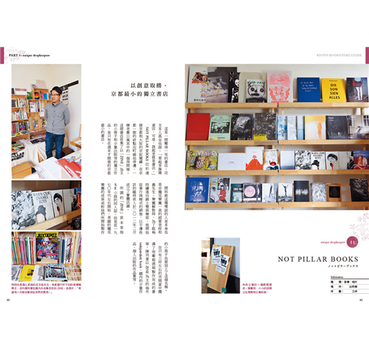 NOT PILLAR BOOKS 位於連接京都和大阪的京阪電鐵,在京都一側的終點出町柳站旁邊、一棟老舊公寓其中的一個房間裡。這間書店收集了以「ZINE」為主的小冊子和少量出版等的獨立作品,是只有在週末才開張的京都最小的書店。