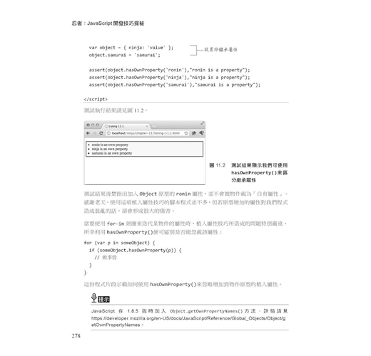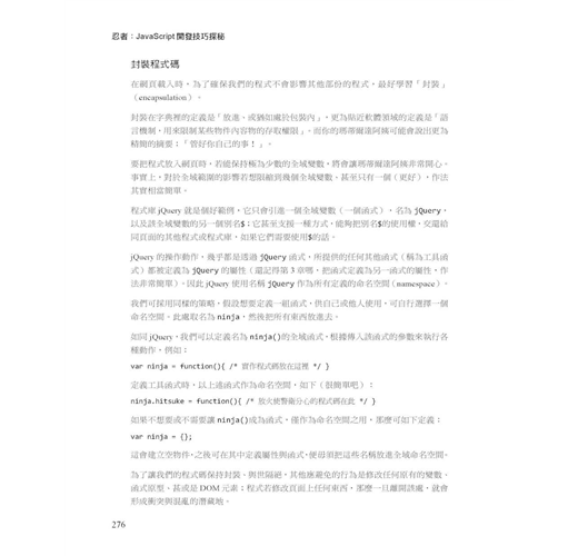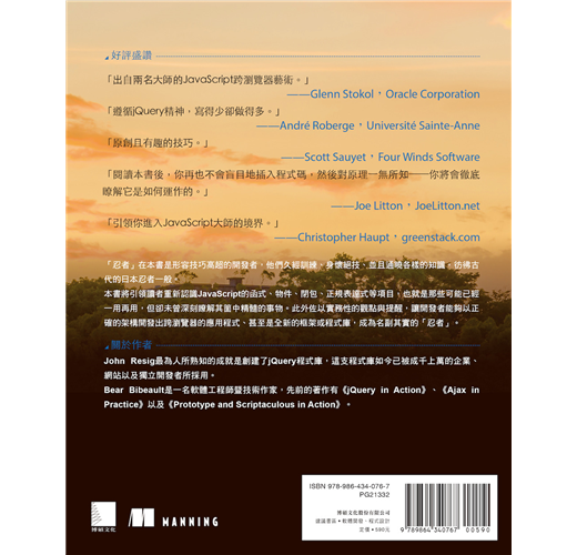 本書將引領讀者重新認識 JavaScript 的函式、物件、閉包、正規表達式等項目,也就是那些可能已經一用再用,但卻未曾深刻瞭解其箇中精髓的事物。此外佐以實務性的觀點與提醒,讓開發者能夠以正確的架構開發出跨瀏覽器的應用程式、甚至是全新的框架或程式庫,成為名副其實的「忍者」。