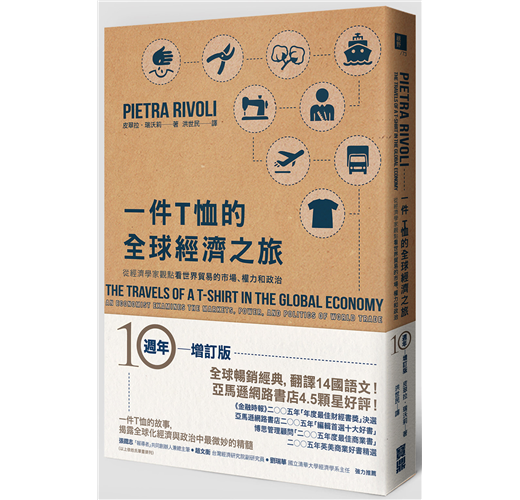 跟著T恤走遍世界貿易地圖皮翠拉‧瑞沃莉專攻國際商業社會議題,她以貼近大眾生活的一件簡單T恤為引,從追蹤其來源展開一場調查之旅,足跡踏遍德州棉花田、上海紡織廠,甚至到坦尚尼亞二手衣市場進行研究,探討現代企業與全球化演變在各國的政治、歷史、經濟、道德上造成的影響與困境。