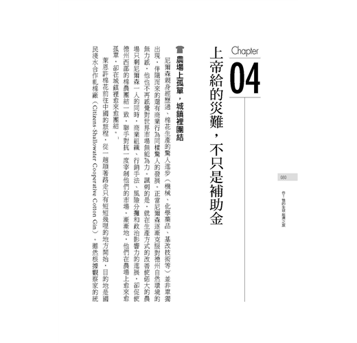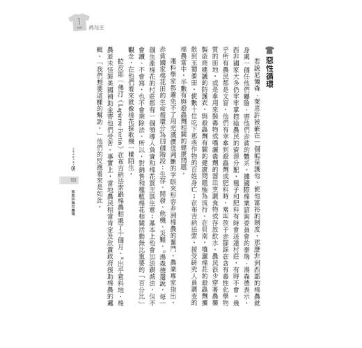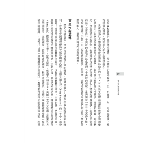 於是,接下來的七個年頭,我踏遍世界尋找答案。我不只找到我身上的T恤是誰做的,也跟著它的製造過程穿越千里、跨過三個大陸。這本書講的就是創造棉質T恤的人物、政治和市場的故事,一個全球化的故事。