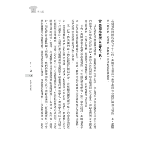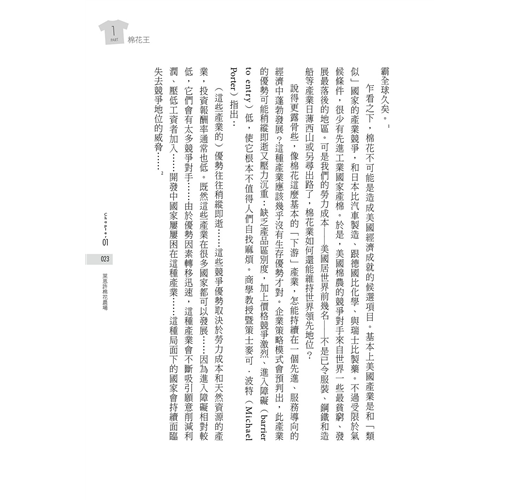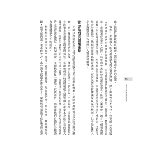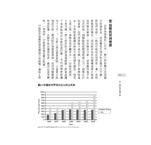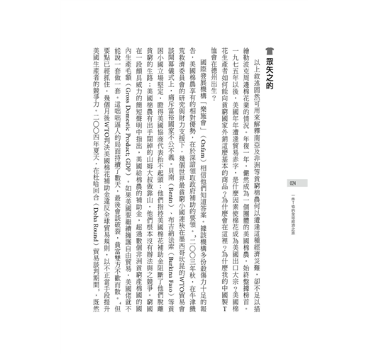 揭露檯面下的市場干預與政治角力書中真實人物的日常故事與專業的數據資料,意外揭開全球化的爭議點:全球化不只是經濟問題,政治在其中更是無孔不入。從自由貿易談判到關稅保護,從基改托拉斯到弱勢棉農自殺潮,從血汗工廠到公平勞動,從產業污染到環保意識;作者抽絲剝繭,娓娓道來這個被擁護者與批評者過度簡化的國際貿易世界。