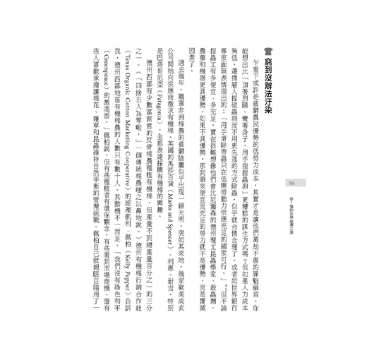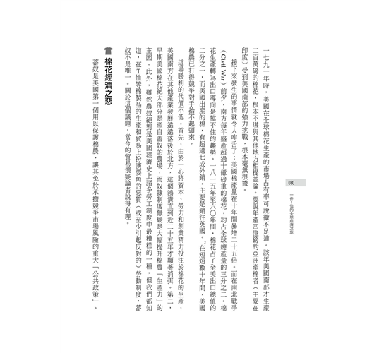 因此,雖然蓄奴的確能讓棉農避開勞動市場的風險,但這仍未解釋其他國家為何無法掌握工業革命造就的機會。工廠式的棉花生產作業尚需其他機制──財產權、誘因結構(incentive structure),還有今天所謂的「管理」──支持並扮演吃重的角色。時至今日,管理仍是不可或缺的要角,也是諸多貧窮產棉國的一大挑戰。在馬利(Mali)、布吉納法索和貝南這些國家的惠特尼們應該也沒有嘗試的理由。