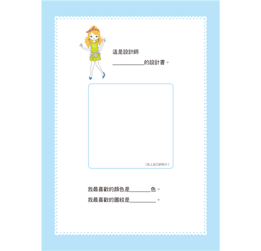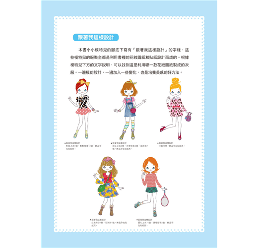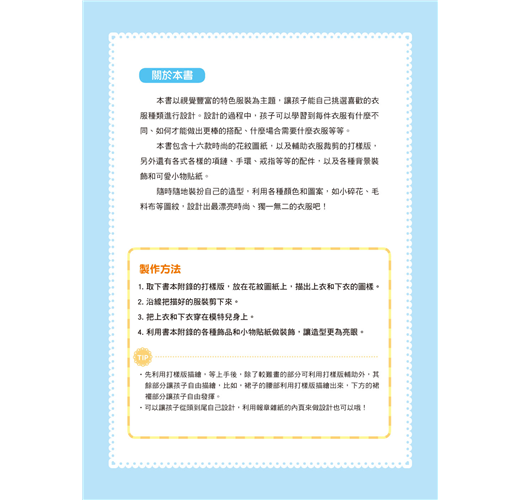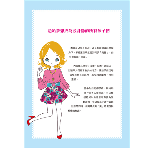 送給夢想成為設計師的所有孩子們本書以視覺豐富的特色服裝為主題,讓孩子能自己挑選喜歡的衣服種類進行設計。設計的過程中,孩子可以學習到每件衣服有什麼不同、如何才能做出更棒的搭配、什麼場合需要什麼衣服等等。