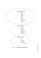 至於全球英語散布的情況,印度裔美國學者Kachru(1985)曾用三個同心圓(如圖一)來表示:(1)內圈(inner circle)是傳統以英語為母語的國家,如美國、英國、加拿大、澳洲、紐西蘭、愛爾蘭等國;(2)外圈(outer circle)是賦予英語法定地位而成為一種通行語言的國家如新加坡、印度、馬來西亞、馬拉威等五十餘國;(3)擴展圈(expanding circle)則泛指世界其他以英語為外語的國家,包括臺灣、中國、日本、俄羅斯、沙烏地阿拉伯、希臘、波蘭等,而且數量仍在擴增中。在這三個同心圓中的國家對於英語的使用也有很大的差異,內圈國家基本上是提供英語規範(norm-providing),尤以英美兩國為甚;外圈國家是發展規範(norm-developing),通常致力於建立本土英語的規範(localized norm),而發展出具語言和文化特色的英語如新加坡英語(Singlish)和印度英語(Indian English);擴展圈國家則是依賴規範(norm-dependent),遵循內圈國家所提供的語言標準來使用英語。
