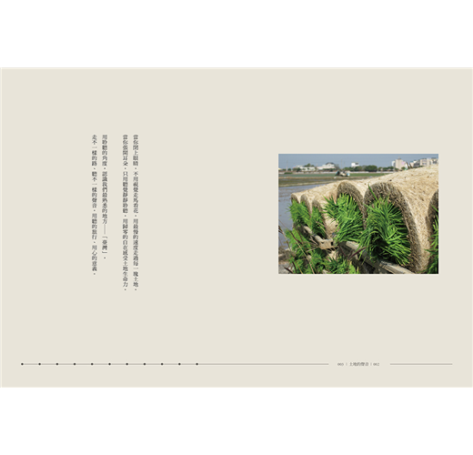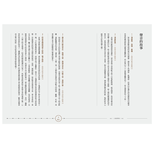 ──沿途蒐集屬於我們「土地的聲音」//阿里山竹林因風吹過而婆娑起舞的莎莎聲、台西五條港海邊蛤蜊吐海水而譜出的輕快小調、那瑪夏原住民在午後暖陽中剝玉米粒的脆響、臺南大仙寺清晨濃霧中傳來的悠悠鐘響、梨山上紅色鐵牛車換檔的機械聲、夜風中公園醉人的卡拉OK歌聲、學校裡專屬青春的喧鬧聲、富有魔力的美濃大灶燒柴劈啪聲……//