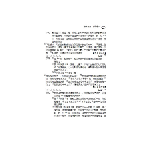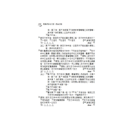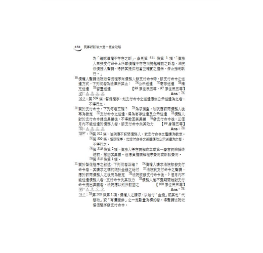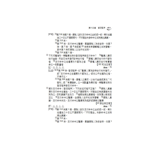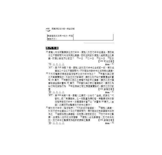給讀者的學習建議:在此建議考生將自己的筆記、考試重點直接整理於法典中。民事訴訟法是極為重視法條記憶的科目,如果沒有以記憶法條為基礎,不僅簡單的問題無法回答,困難的題目也完全沒有推論的依據。所以請永遠記得,當考生在唸書時,旁邊一定要有本六法全書,必須勤閱法條增加熟悉度。再次強調,法條熟悉度與上榜速度永遠都是成正比的。因此,書中只要出現條文號碼的地方,請一定要親自動手翻閱法典-反覆參看是加強記憶的不二法門。此外,民事訴訟法實務色彩特別濃厚,實務見解亦屢次出現於題目中,最重要、最新的判例、司法院解釋之見解,本書均已於內文中提出並說明。此外,曾經成為考試題目之其他法律如民法、家事事件法、鄉鎮市調解條例、強制執行法等規定,本書亦於適當處作說明,以求滴水不漏,並大幅節省考生自行搜集資料所需花費的時間。