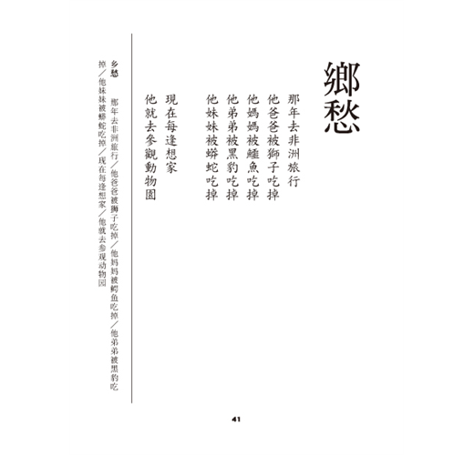 那年去非洲旅行/他爸爸被獅子吃掉/他媽媽被鱷魚吃掉/他弟弟被黑豹吃掉/他妹妹被蟒蛇吃掉/現在每逢想家/他就去參觀動物園