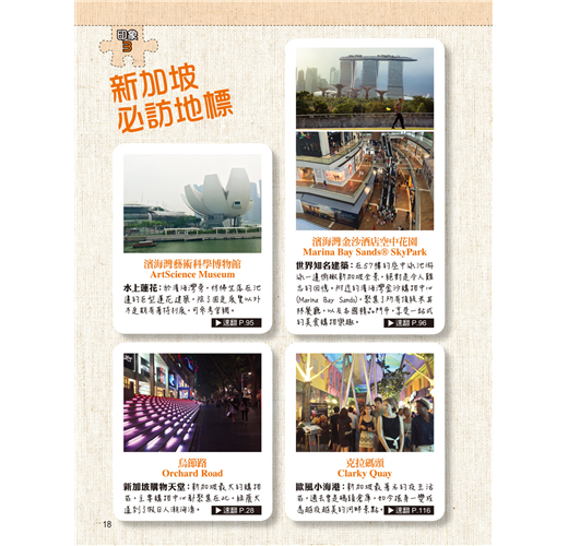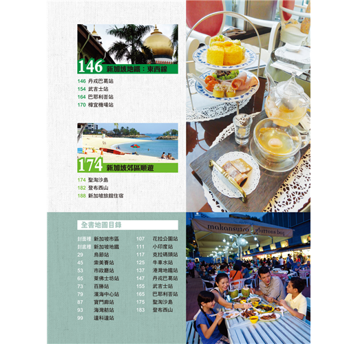 特別收錄「聖淘沙島」與「登布西山」兩大豐富遊賞區域,儘管不在捷運系統上,亦有規畫良好的接駁運輸,方便遊客輕鬆前往全年藝文活動不斷、充滿大型娛樂設施的聖淘沙島,與飽富特殊殖民文化遺跡的世外桃源登布西山。
