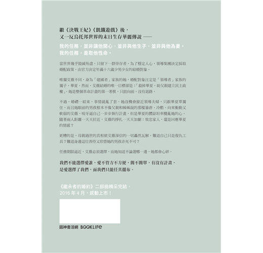 唯獨艾薇不同,身為「建國者」家族的她,婚配對象注定是「領導者」家族的獨子,畢夏。然而,艾薇結婚的唯一目標卻是,「殺掉畢夏,助父親建立民主政權」。她是整個革命計畫的第一著棋,只能向前,沒有退路。