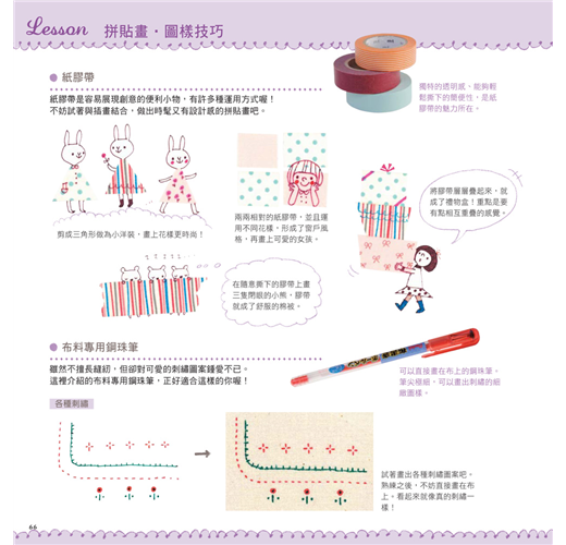 本書包括:簡單逗趣、時尚多彩、童話可愛、柔美溫柔、俏皮繽紛等五種風格,從可愛的動物大頭貼、人物動作教學、日常交通工具、裝飾性文字運用,以及將可愛塗鴉運用在手帳、標籤、立牌、祝賀小卡上,利用紙膠帶、布料、手機殼,讓可愛插圖豐富我們的小日子~