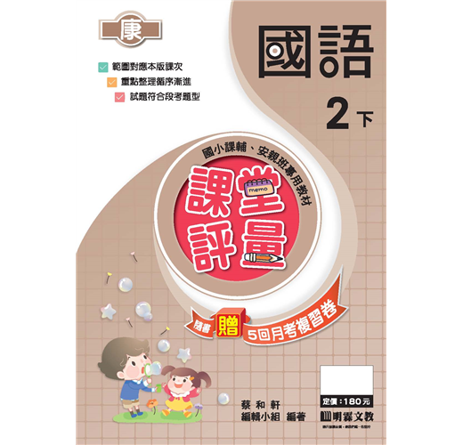 國語科課堂評量針對各版本設計,並依各年段難易度不同,適時補充詞彙、成語、句型及延伸學習,讓學生除了精熟課內重點,更能吸收相關的語文知識。
