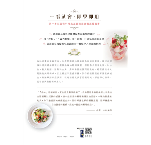 「『品味』這種東西,實在是太難以捉摸了。我希望這本書能夠用文字表達出那種難以捉摸的感覺,讓一盤日常的料理變得更加美好。本職為插畫家的我,除了最重要的味覺組合外,同時考量色彩的優雅呈現,發揮繪畫時自由發想的靈感,完成一盤盤的料理作品。」──作者 中村美穗