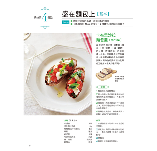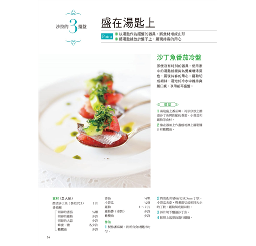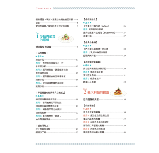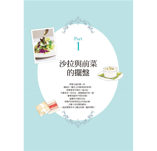 身為插畫家兼料理家,作者用獨特的審美視角與清新畫風,解說如何讓料理與擺盤展現出優雅品味的聰明訣竅,搭配各式創意食譜,以沙拉、義大利麵、甜點為主角,用市場就能買到的食材,輕鬆擺出令人驚艷的美好餐桌。加上看起來豐盛華麗,製作卻很簡便的單盤套餐組合,無論舉辦家庭派對,或邀請好友共享用餐時光,都能得心應手,從容扮演最佳餐桌主人!