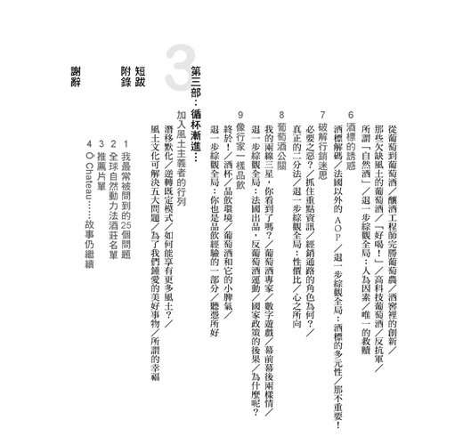 我的兩線三星,你看到了嗎?∕葡萄酒專家∕數字遊戲∕幕前幕後兩樣情∕退一步綜觀全局:法國出品,反葡萄酒運動∕該政策的後果∕為什麼呢?
