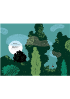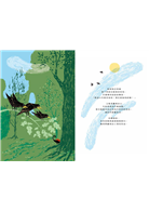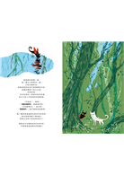 繪者大膽運用色彩的層次感,筆觸充滿恣意隨興、形體極富童趣。大野狼穿過頁面的表現,有十足伺機而動的意味;喵喵鳥的位置及視角在前幾個頁面都是渺小不受重視的,直至遇見乳牛,畫面色彩變得輕盈,此時繪者才讓牠的存在顯見份量;可是沉入水裡時,全以黑色為跨頁的主體色,喵喵鳥心情的沉重與絕望是可想而知道。但,最後和喵喵魚在水裡如影隨形的模樣,波動的流水展現著不再受限於旁人的快活。