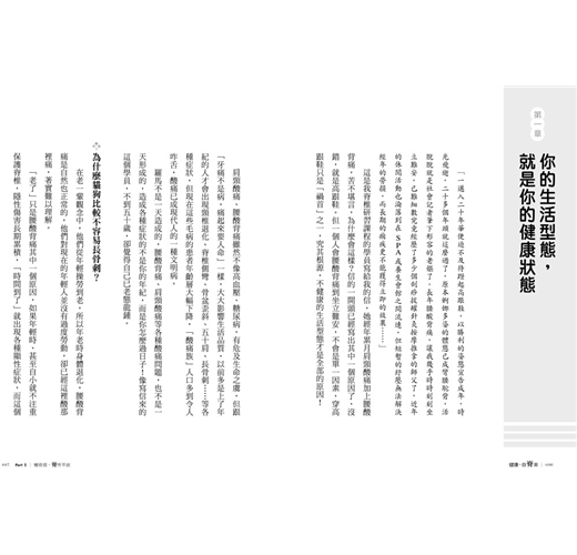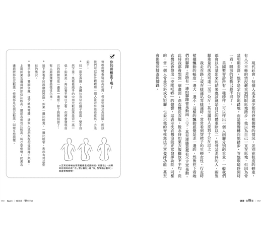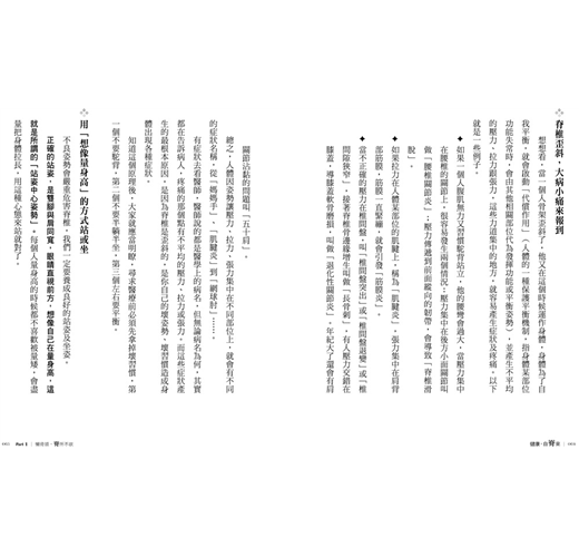 唯有喚醒身體自覺,改變姿勢,才能改變人生。教導你藉由「心的覺察」(瞭解錯誤姿勢與正確知識),再進行「身的改造」(多做書中的強健脊椎運動),加上「環境的支持」(使用符合人體工學的物品),由內而外建立完整的身心合一脊椎健康模式。