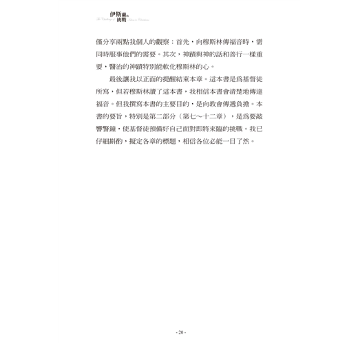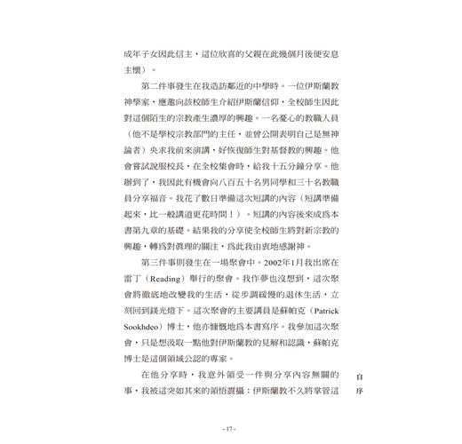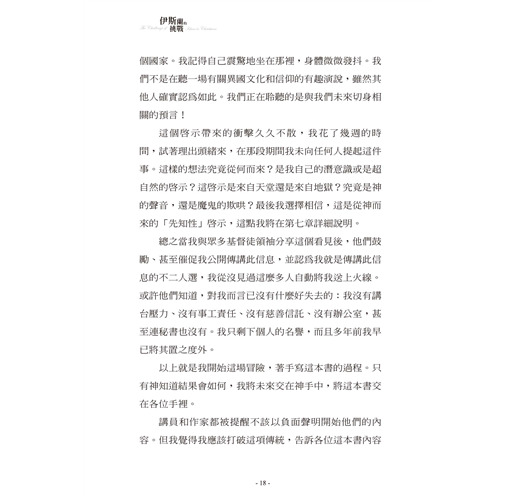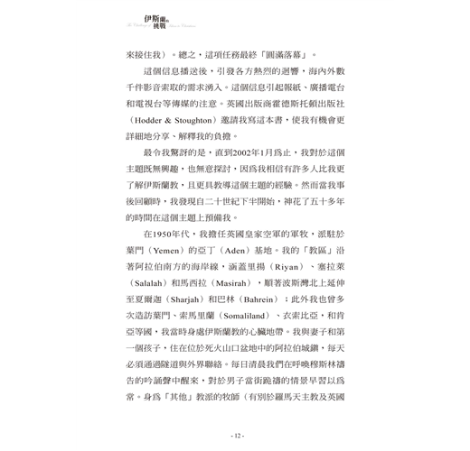 他在本書精闢闡述了此論點背後的成因,更重要的是,大衛.鮑森針對伊斯蘭教看似銳不可擋的增長趨勢,為教會提供了一個具有建設性的藍圖!基督徒必須重新發現、並向世人展現三種特質(因為這正是讓基督教無比獨特的原因):真理、關係和公義。英國的現況是世界的縮影,本書是當代每一位基督徒的必讀之作。