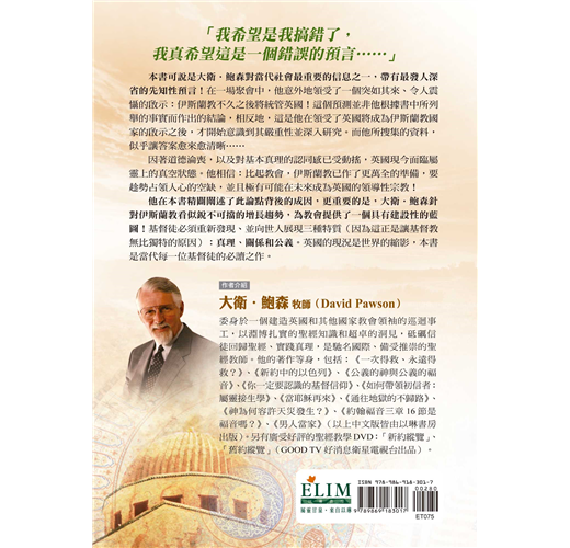本書可說是大衛.鮑森對當代社會最重要的信息之一,帶有最發人深省的先知性預言!在一場聚會中,他意外地領受了一個突如其來、令人震懾的啟示:伊斯蘭教不久之後將統管英國!這個預測並非他根據書中所列舉的事實而作出的結論,相反地,這是他在領受了英國將成為伊斯蘭教國家的啟示之後,才開始意識到其嚴重性並深入研究。而他所搜集的資料,似乎讓答案愈來愈清晰……