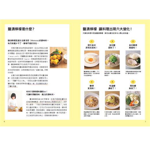 鹽漬檸檬的做法非常簡單。在瓶子裡裝進鹽和切成塊的檸檬醃漬,原封不動地放上兩週就完成了。或許有人會想:「不就只是檸檬風味的鹽巴味道嗎?」但是其力量卻很驚人!它可以引出食材原有的味道、讓料理味道更濃醇、降低魚腥味,像魔法般把料理修飾得更美味。還有可以用醃漬方式讓食材變香醇,幾乎是用過一次之後就再也無法停止,是種奇蹟的調味料。
