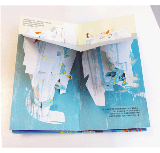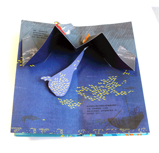 ★《出發吧,海洋號!》的視覺設計是剖面透視的雙重視覺。兩位作者把慣用的直式窄版格式立起來,畫面以八二法則切割,海面下是主軸佔八成,海面上佔兩成。為了營造海面上下並存的雙重視覺,娃娃屋書常用的垂直剖面透視設計便派上用場了。至於立體場景的設計,兩位作者採用傳統的層景透視概念,也就是利用層層景片間的間距產生立體透視效果。所有層景片固定在將海面場景一分為二的海面底板,而這張底板就是立體紙藝最基本的V摺,功用在於翻頁時把V摺拉撐的同時撐開層景片形成立體場景。不曉得作者的本意是否如此,如果稍微把書合起來一點再打開一點,如此慢慢地重覆開合動作,場景就會像真實海面一樣上下波動。──《立體書王國-楊清貴》