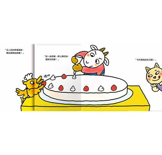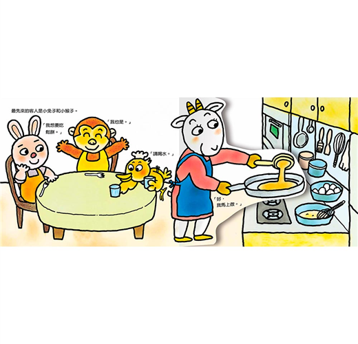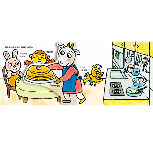 小讀者不但可以從《山羊蛋糕店》中認識各種甜點的名稱、想像好吃的蛋糕滋味,還能透過作者精心設計的翻翻頁玩扮演遊戲,化身甜點師傅和服務生,幫動物們煎鬆餅、切蛋糕捲,以及體驗烤蛋糕的過程。