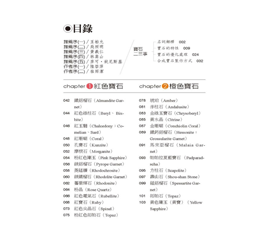 本書包括紅色、橙色、綠色、藍色、紫色、白色、黑色等以光譜區分出的七大類有色寶石,以及瑪瑙、貓眼……等現象寶石、其他寶石等,其中許多寶石是臺灣並不常見的。