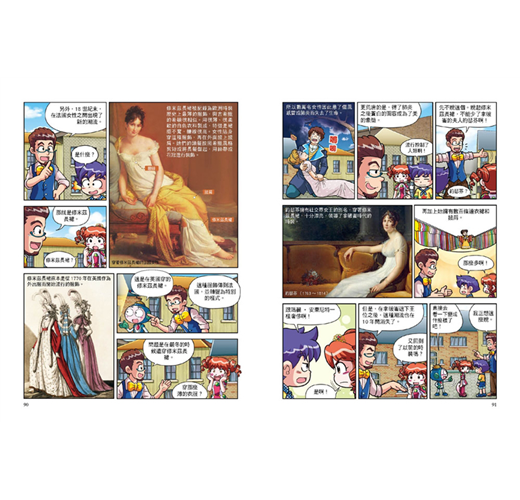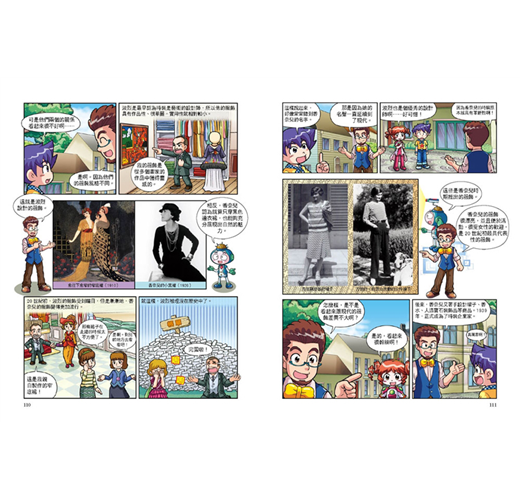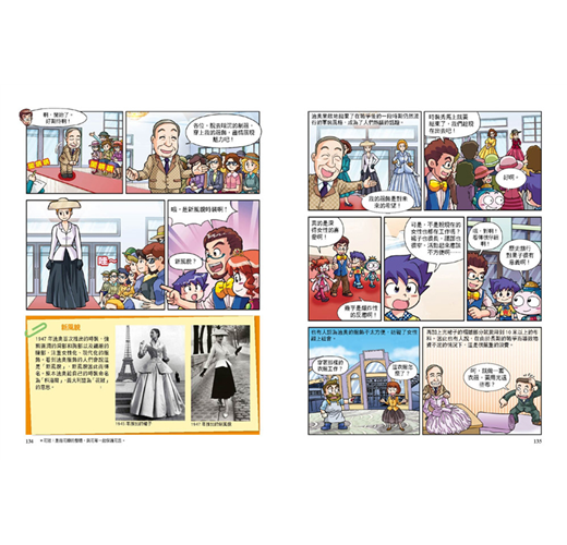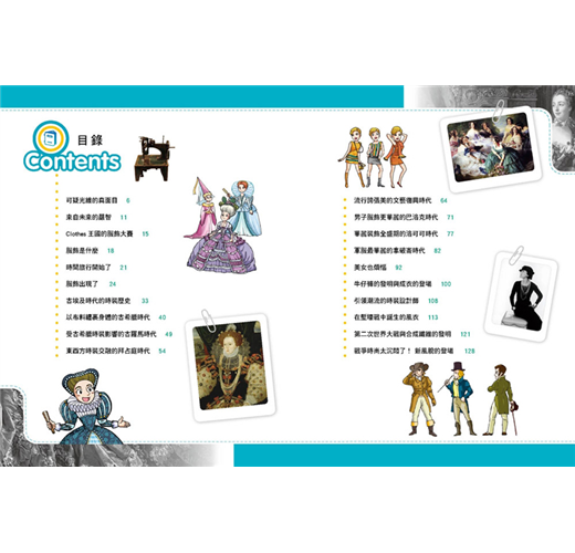 了解服裝的歷史,從新石器時代,服飾起源開始、古埃及時代的亞麻布、古希臘的克拉米斯、希頓等,到文藝復興時代,從巴洛克時代到拿破崙時代,從二戰時期到迪奧、香奈兒時代,將這些服裝史的基礎知識,一點一點透過漫畫放入孩子的記憶中。學習是一件簡單的事情,服裝史不再如想像中困難,可以輕鬆地學會服裝史的通識課程,並從中學習審美、設計觀念的薰陶。