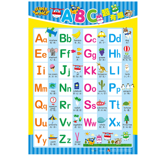 本產品結合SUPERWINGS的熱情與可愛製作色彩鮮豔、圖素豐富的全彩掛圖,讓孩子藉由與家長的互動或自己查看,輕鬆學會英文字母及簡易單字,是幼兒入學前的最佳輔助教具。