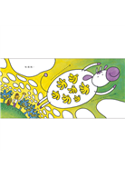 封面封底上,彎彎曲曲的山線、圓形的果樹和色彩繽紛的各類水果,讓人感覺好溫暖。書名頁裡那頭牛,帶著笑容由左往右走;翻頁後,他卻由右往左走,似乎是在水果森林裡來回往返,安心自在。接下來,四個跨頁連續展現主人摘水果,牛把水果吃下的瞬間。雖然是一樣的行動,圖像間的差異卻很有趣,尤其是牛的姿態。吃了香蕉的牛縱身往右上方奔躍;吃了木瓜之後,飛得更高了;吃西瓜就得老實著地了,直接啃進西瓜裡,好專注。到了晚上,吃了楊桃的牛,還能載著主人採集天上的星星呢。主人著涼感冒了,這頭日夜都吃水果的牛,不急不徐地吃著草莓,為主人產出草莓牛奶;也為感冒的鄰居準備各種水果牛奶。如我們所料,喝了水果牛奶,大家都恢復健康了。簡短的故事,清楚表達「吃水果,身體好,不易感冒」的訊息。雖然敘事企圖十分明顯,這本書卻很有活力。鮮明活潑且具設計感的圖像,重複出現的彎曲線條、明亮的顏色、長著各種水果的圓形樹木、身體透明的牛,和牛的飛翔,一起營造出奇幻的氛圍,為水果牛奶的戲。