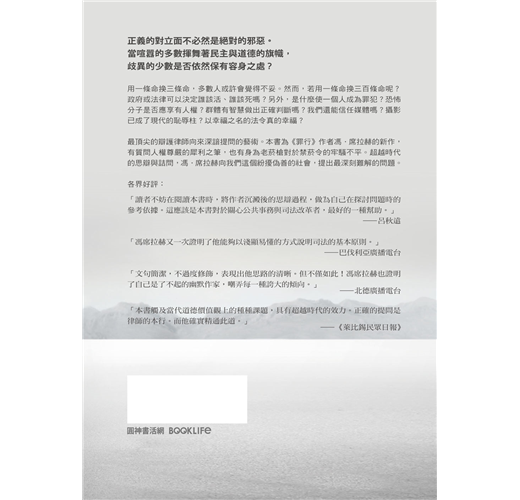 「本書觸及當代道德價值觀上的種種課題,具有超越時代的效力。正確的提問是律師的本行。而他確實精通此道。」《...