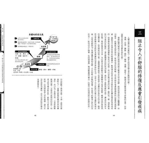 各位都有長時間跪坐之後腳麻站不起來的經驗,麻痺也是回復血流的身體反應。血流開始回復之後,身體發癢和起疹子是要把進入身體的抗原排出去的反應。腹瀉則是要將體內有害物和老舊廢物快速排泄掉的作用。這些令人不舒服的反應正是身體的修復反應,是免疫細胞為了保護身體而開始活躍,正在和敵人作戰的證據,但是現今的醫學已經忘記這件事了。