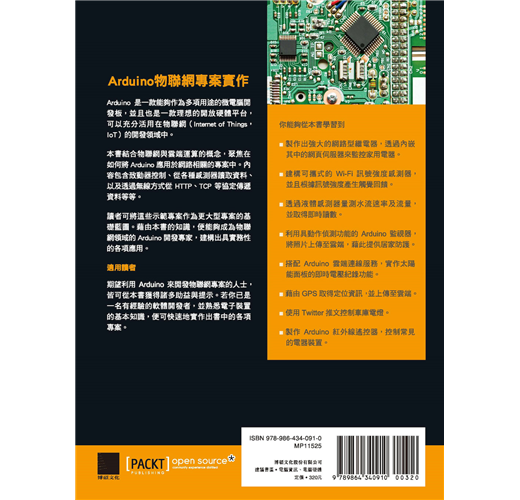 期望利用 Arduino 來開發物聯網專案的人士,皆可從本書獲得諸多助益與提示。若你已是一名有經驗的軟體開發者,並熟悉電子裝置的基本知識,便可快速地實作出書中的各項專案。