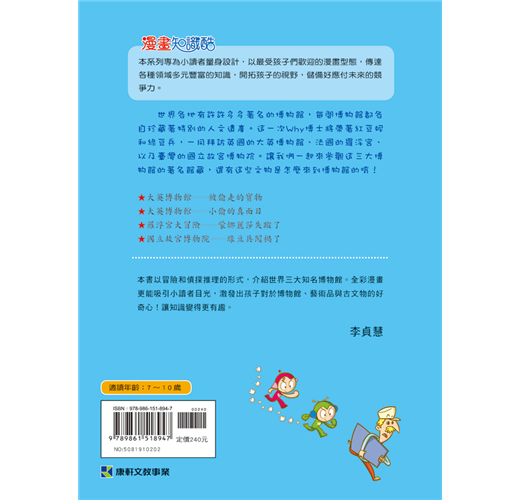 本書以冒險和偵探推理的形式,介紹世界三大知名博物館。全彩漫畫更能吸引小讀者目光,激發出孩子對於博物館、藝術品與古文物的好奇心!讓知識變得更有趣。——李貞慧