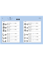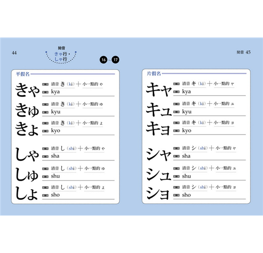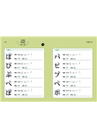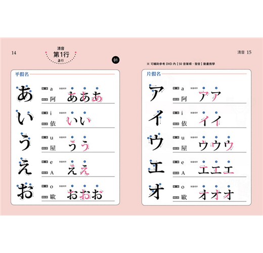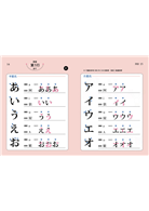 ‧[左頁]平假名,[右頁]片假名,基本50音,各行逐字教學。