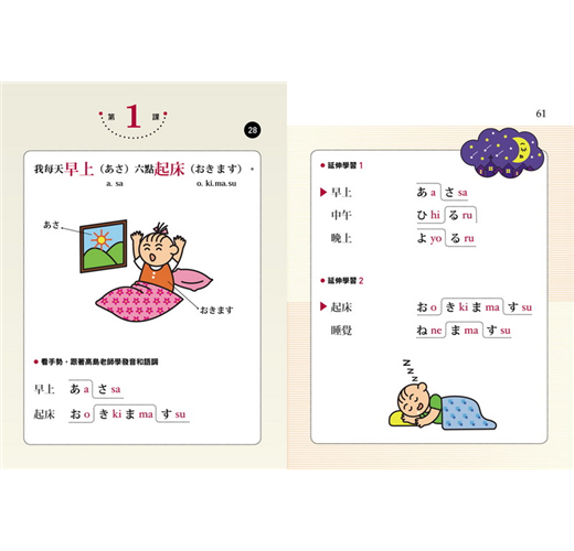 ‧延伸學習:學了「早上」,也會說「中午、晚上」;學了「起床」,也會說「睡覺」。