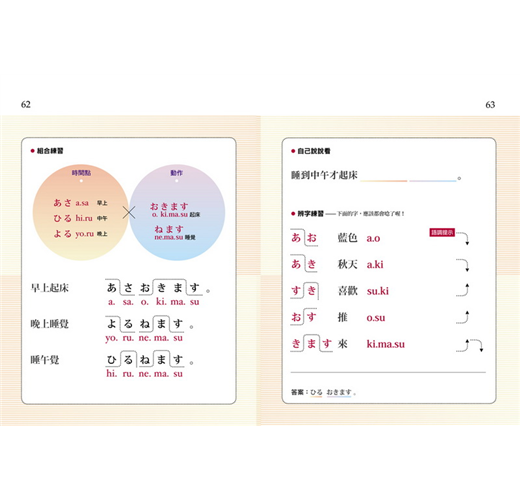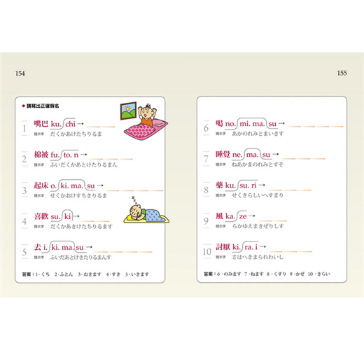 取材生活情境,規劃20課基礎日語。內容簡易實用,例如:我每天早上(あさ)六點起床(おきます)、今天的風(かぜ)很強勁(つよい)。各課包含: