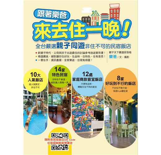 親子天下嚴選的部落客──樂爸,帶著孩子「阿成」全台玩透透,對於旅遊住宿,他有深刻體驗,也有一套評選標準。《跟著樂爸來去住一晚》是樂爸從全台玩過、住過的多家民宿飯店中,嚴選精挑44家最值得推薦給親子共遊的家庭,包括:10大人氣飯店、14家特色民宿、12處家庭商旅皆宜飯店、8家好玩到不行的飯店。