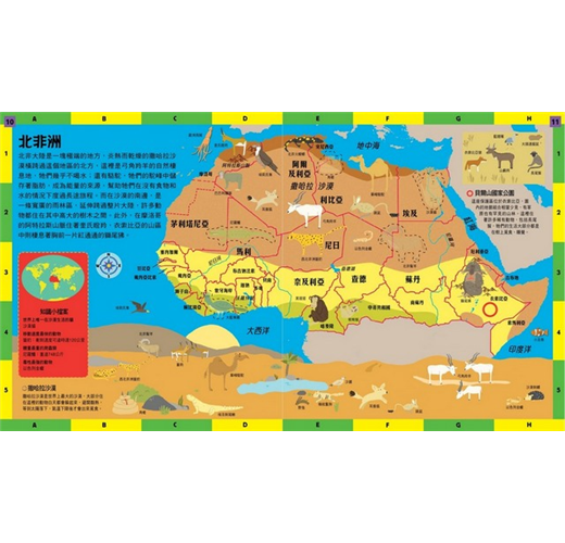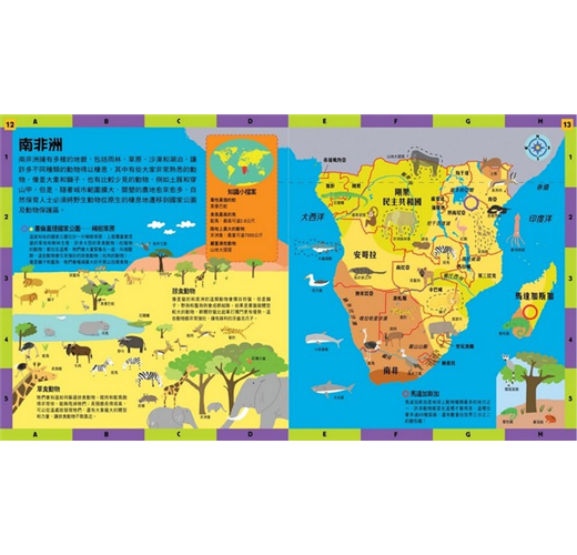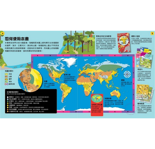 在講動物之前,要先認識生物群落(植物特性);在看生物群落之前,要先建構地理環境(山脈海河)的大範圍概念;在談地理環境之先,要學會使用地圖,例如座標系統、羅盤方位、縮圖與圖例的概念。這本「世界動物地圖」的架構性是良好的。