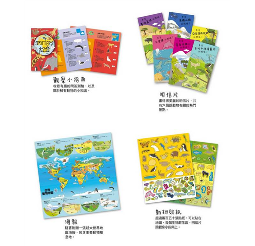 本書並附有250多張貼紙、6張名信以及個人專屬的觀察小指南,讓小朋友可以怎麼玩都不會膩。