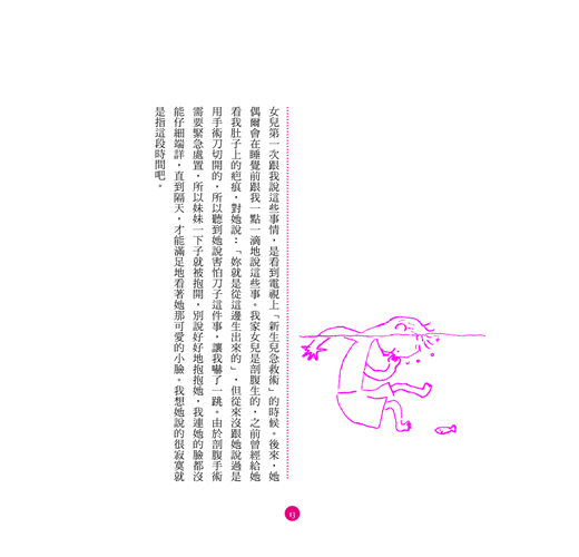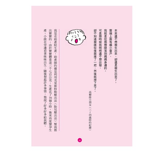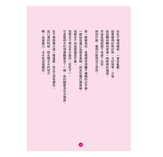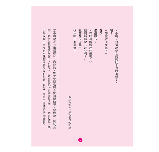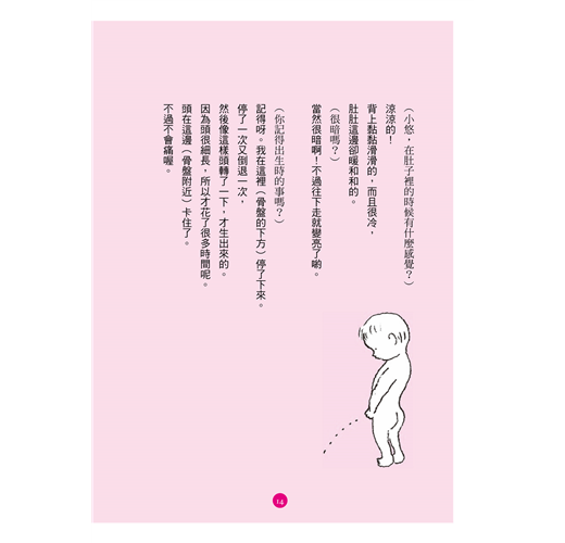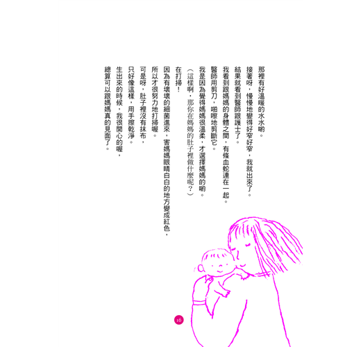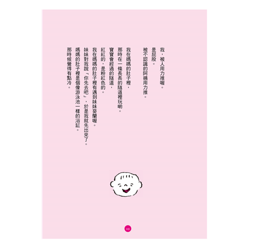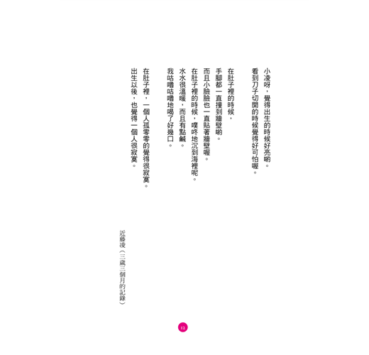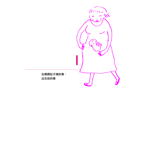 「我在媽媽的肚子裡,那時在一條長長的隧道裡玩喲。紅紅的,是粉紅色的。」