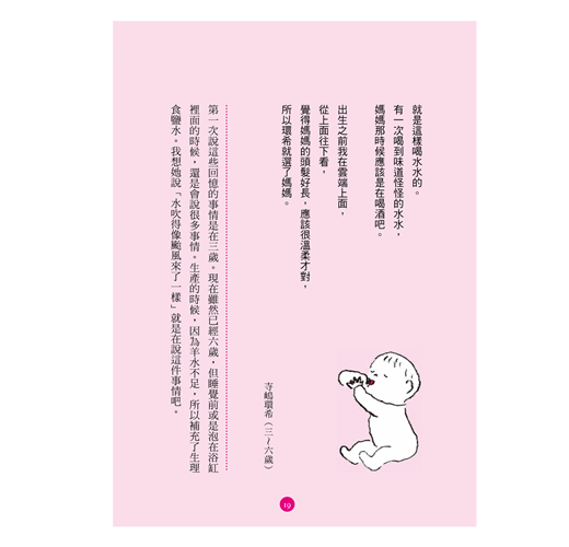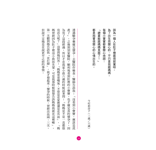 「一直都記得呀。像這樣睡覺,或是輕輕滾來滾去。我聽到爸爸說:快點到醫院去吧!」