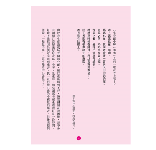 「我是因為聲音選了媽媽的。雖然天神說:她很忙,沒辦法常常陪在你身邊喲。但是沒關係的。我想在這樣媽媽的肚子出生。」