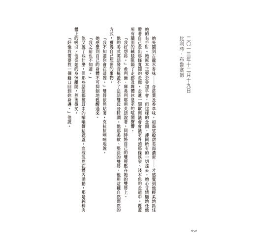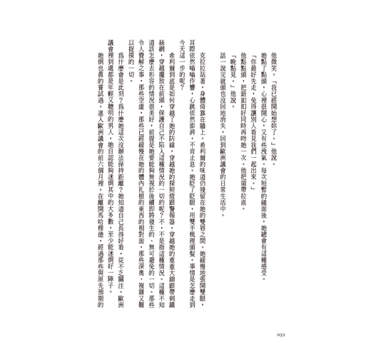 為什麼會是此刻?為什麼她這次沒辦法保持距離?她知道自己長得好看,從不乏關注。歐洲議會裡到處都是年輕又聰明的男人,她自認能夠迷倒其中的大多數,至少能迷倒好一陣子。